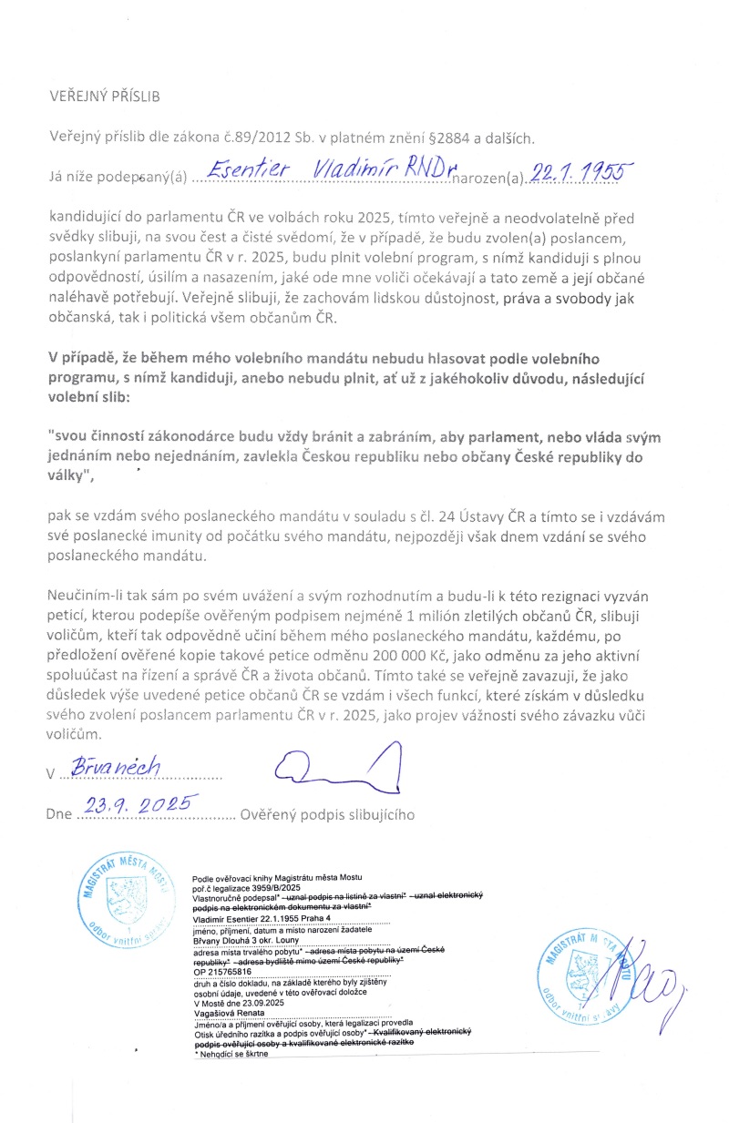 | 10 | Česká republika na 1. místě! | 1 | Esentier Vladimír RNDr. Ing. | 70 | specialista civilní obrany | ✔️ | veřejný příslib |